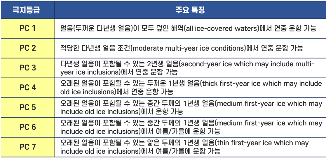Polar Code는 국제선급협회(IACS)의 통합요건에 따라 극지해역에서 운항할 수 있는 선박을 얼음의 종류와 운항 계절에 따라 극지등급(Polar Class)으로 구분하고 있다. PC 1 등급은 모든 얼음 조건에서 연중 운항 가능한 가장 높은 등급이며, PC 7 등급은 얇은 1년생 얼음 조건에서 여름과 겨울에 운항 가능한 가장 낮은 등급이다.